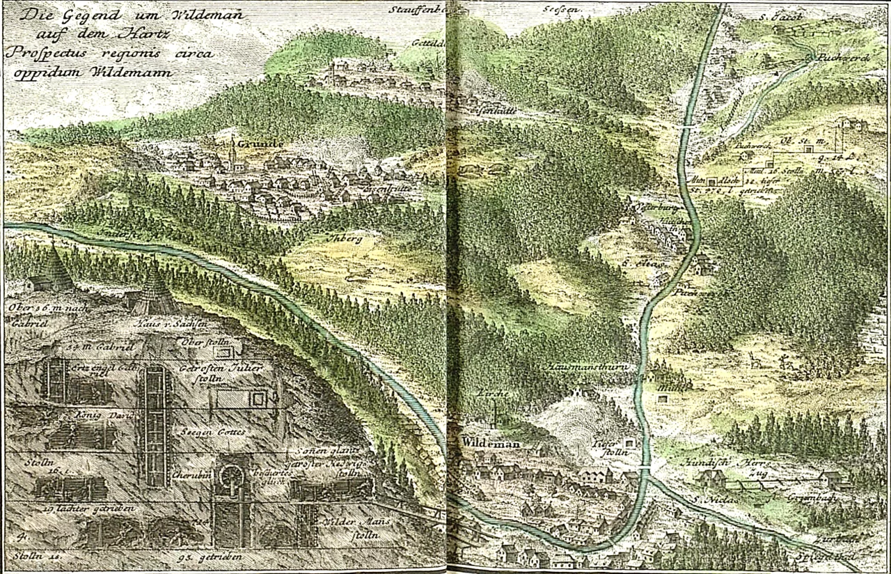 Ausschnitt aus: Prospecte des Hartzwalds nebst accurater Vorstellung der auf selbigem gebraüchlichen Bergwerks-Machinen, Ertz-und Præge-Arbeiten, als ein Anhang zur Geographischen Charte des Hartzwalds, hrsg. von Homanns Erben 1735, http://www5.kb.dk/maps/kortsa/2012/jul/kortatlas/object77418/da